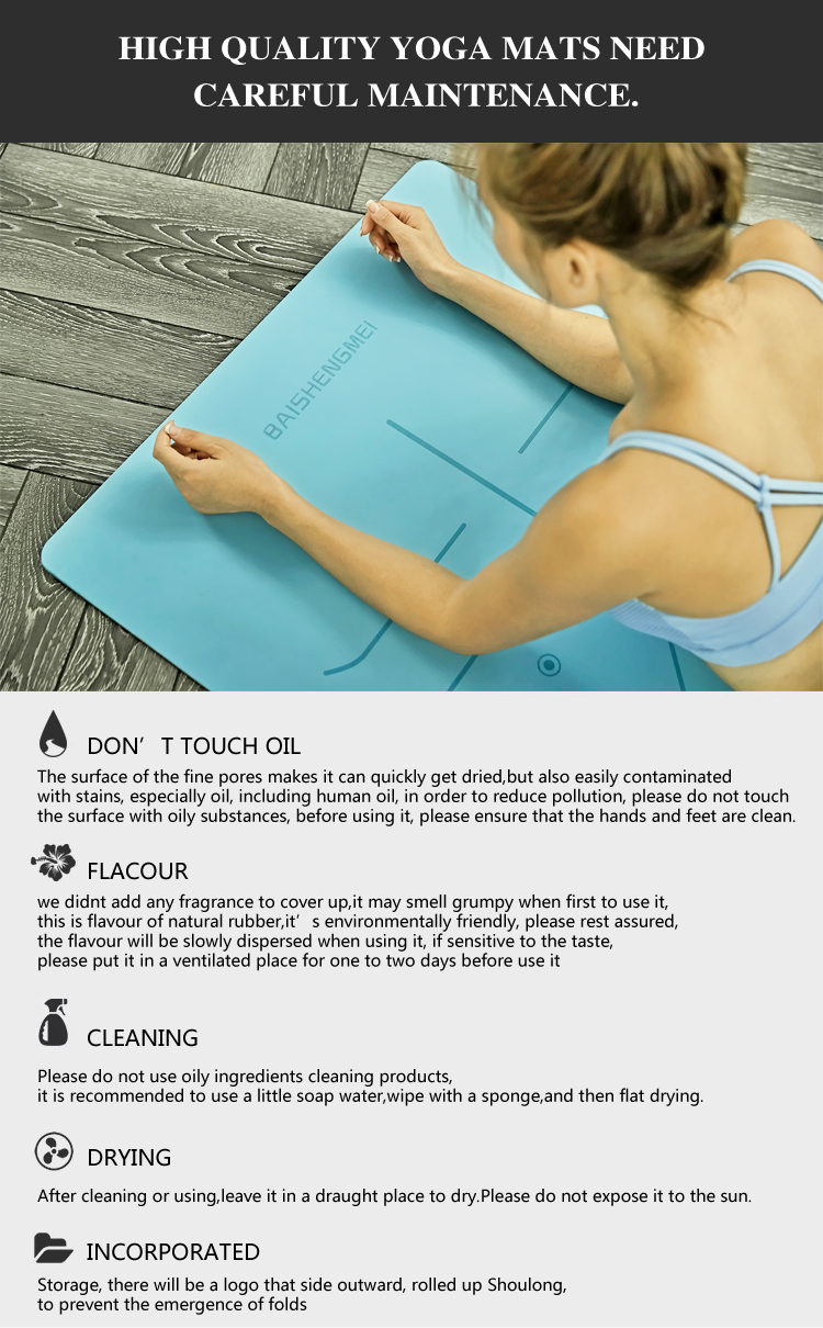 (1) Our Natural Rubber PU yoga mat is made of natural rubber and PU. A combination of nature and science, is worth the value. (2) Our natural rubber is selection of high quality natural rubber material from tropical rainforests . New mat has little flavor when first time opened but very healthy. (3) Our Natural Rubber PU yoga mat has many features: non-slip, absorbent ,high abrasion resistent - shock absorption, anti-tear, pliable - tough, etc. (4) Our Natural Rubber PU yoga mat with position guide line laser engraved gives you gorgeous touch and accurate position.